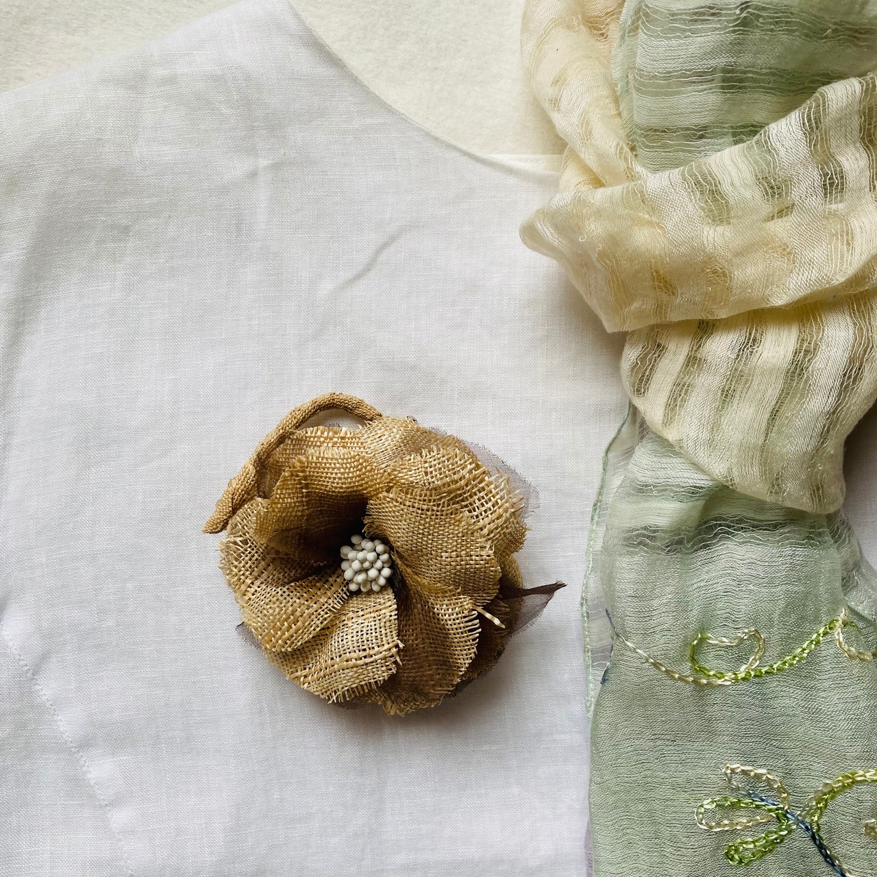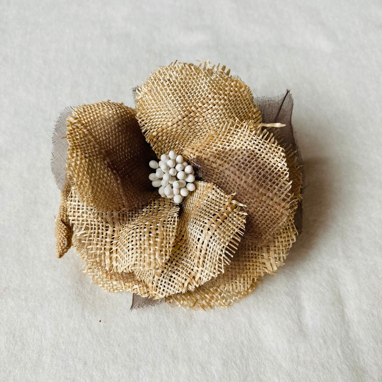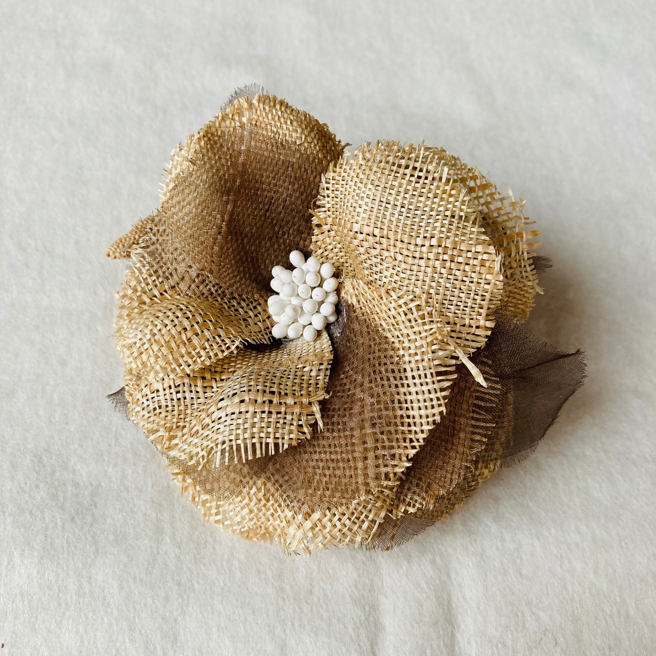 太めに作った芭蕉糸で粗目に織り上げた芭蕉布で作ったコサージュです。アクセントに配したオーガンジーが柔らかさを出しています。お洋服にもお帽子にもお使いいただけます。