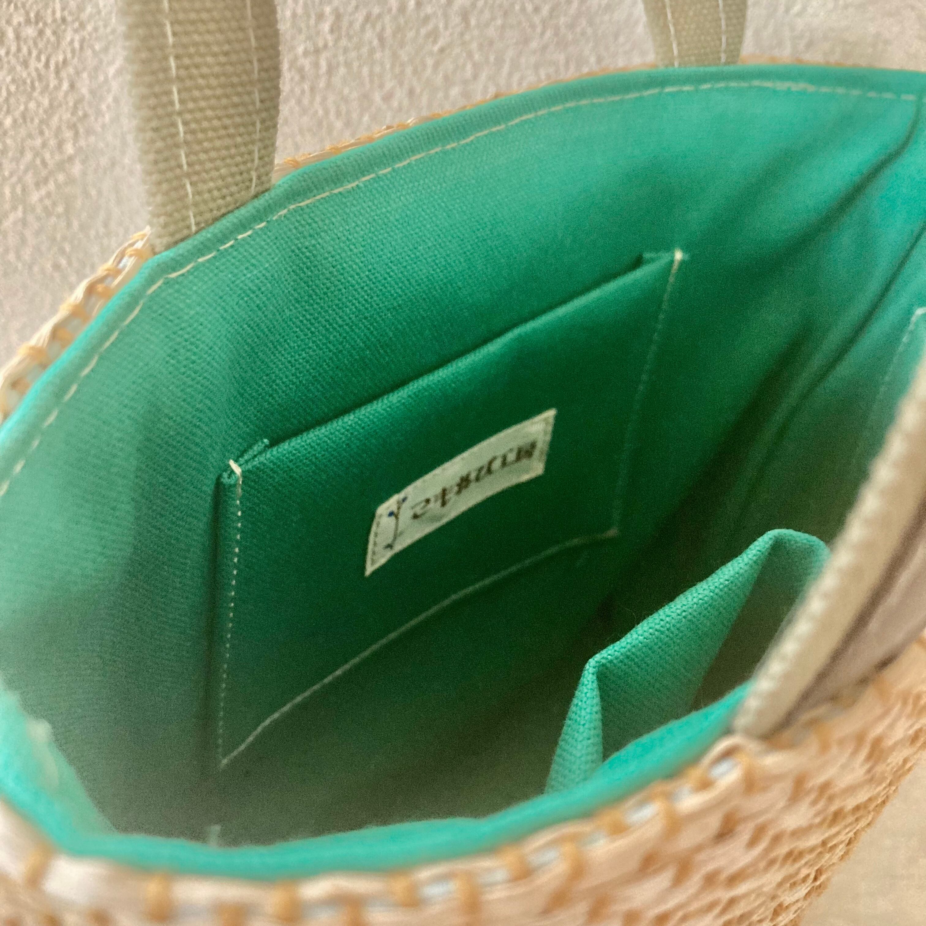 持ち手はテープと牛革のコンビです。内側は緑色の丈夫な化繊を使っています。